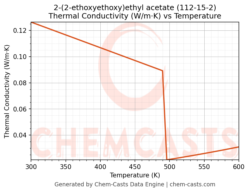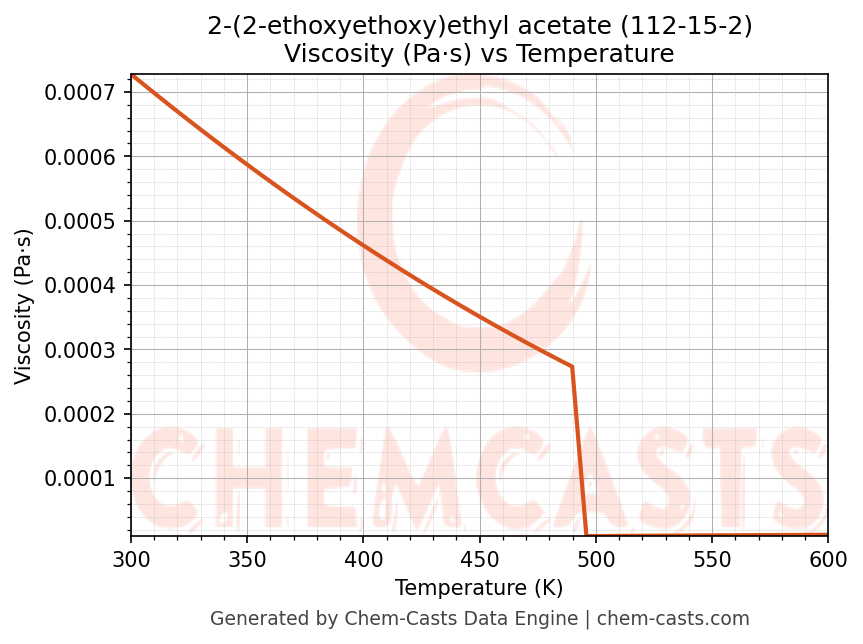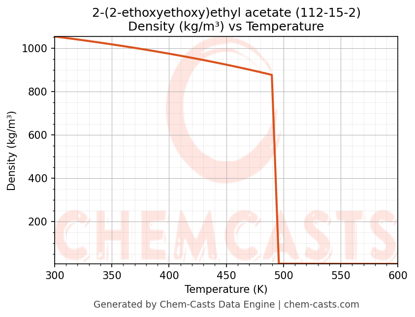 This page presents the temperature-dependent thermodynamic and transport properties of 2-(2-ethoxyethoxy)ethyl acetate (CAS 112-15-2) calculated at a constant pressure of 1 atm (101325 Pa) over the temperature range 250-500 K.