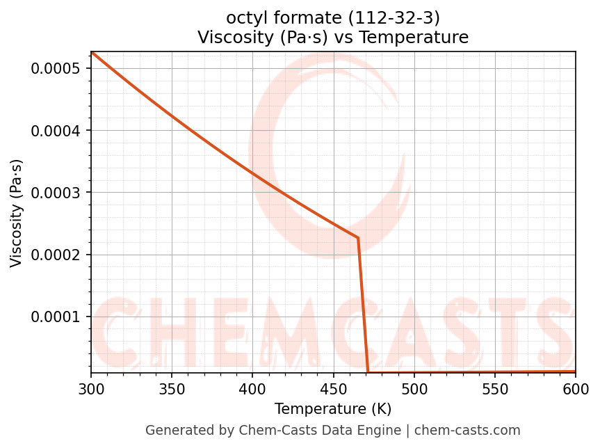 This page presents the temperature-dependent thermodynamic and transport properties of octyl formate (CAS 112-32-3) calculated at a constant pressure of 1 atm (101325 Pa) over the temperature range 250-500 K.