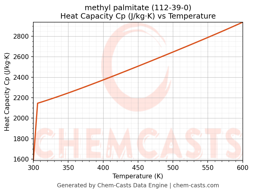 - Specific heat capacity (Cp) indicates the amount of energy required to raise the temperature of methyl palmitate and is critical for energy balance and heat-exchanger design.