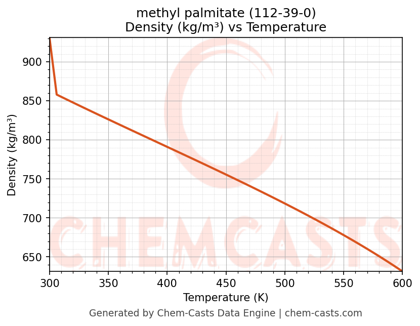 This page presents the temperature-dependent thermodynamic and transport properties of methyl palmitate (CAS 112-39-0) calculated at a constant pressure of 1 atm (101325 Pa) over the temperature range 250-500 K.