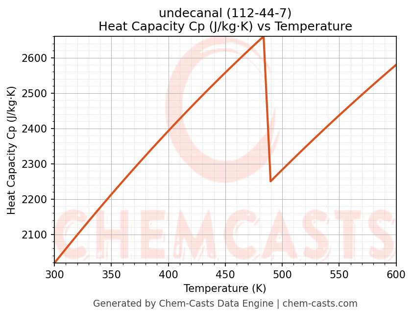 - Specific heat capacity (Cp) indicates the amount of energy required to raise the temperature of undecanal and is critical for energy balance and heat-exchanger design.
