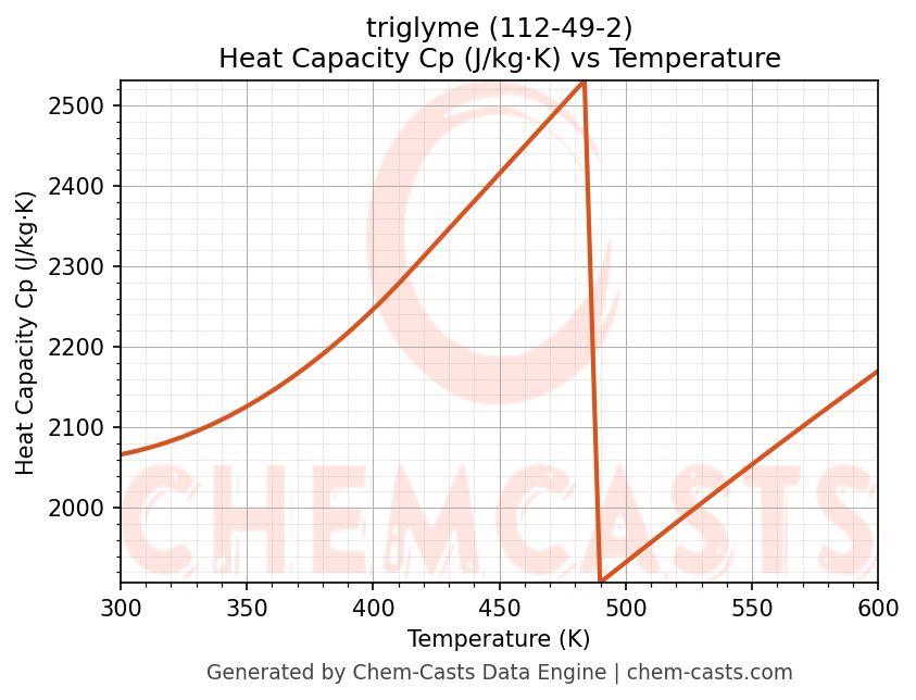 - Specific heat capacity (Cp) indicates the amount of energy required to raise the temperature of triglyme and is critical for energy balance and heat-exchanger design.