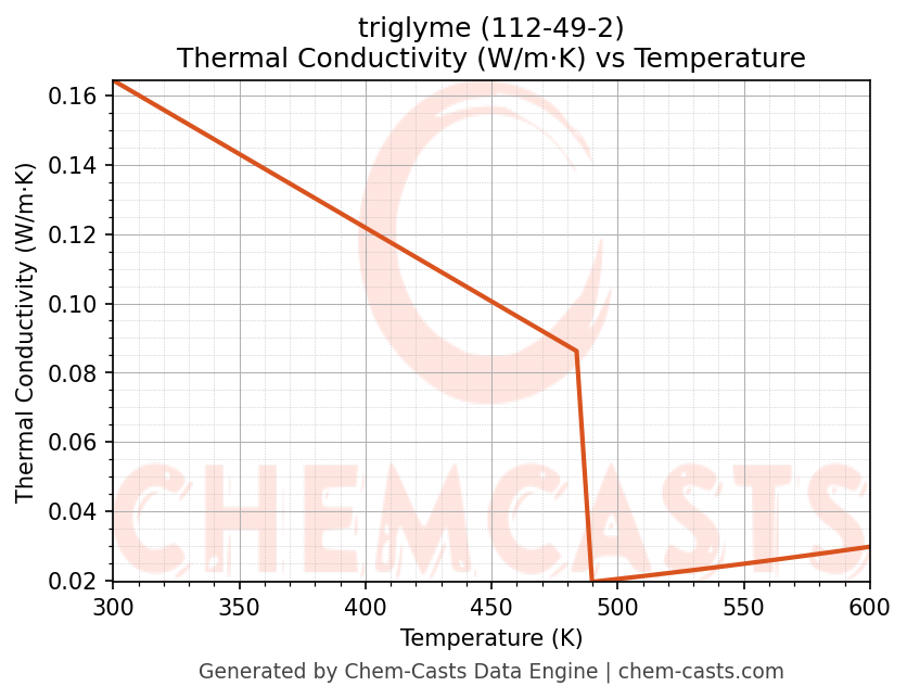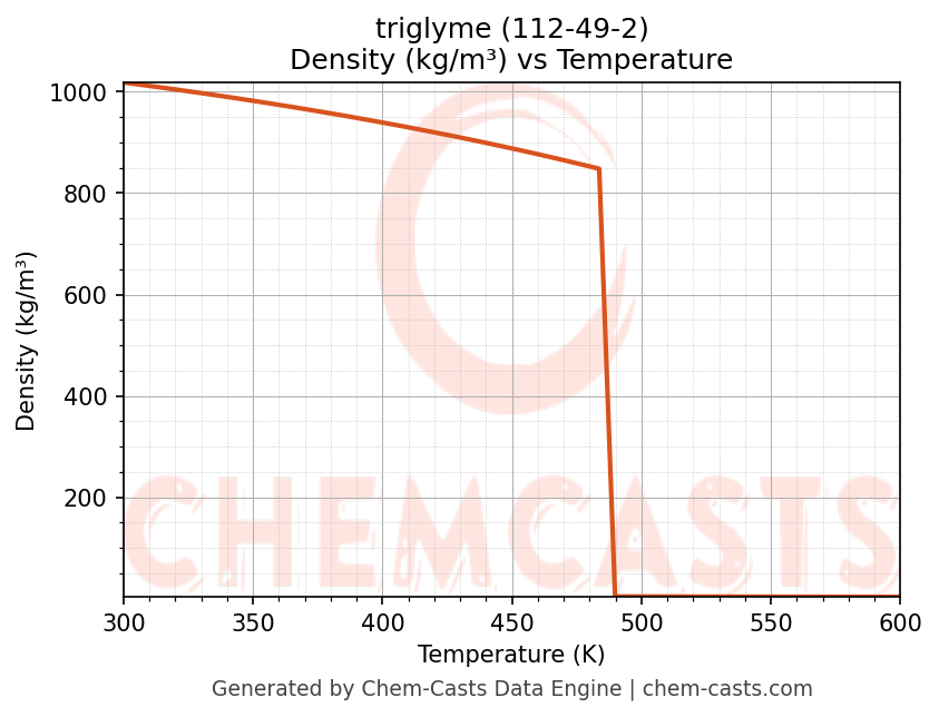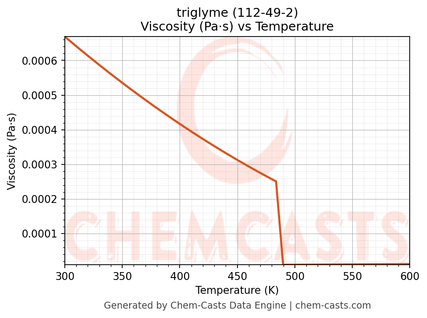 This page presents the temperature-dependent thermodynamic and transport properties of triglyme (CAS 112-49-2) calculated at a constant pressure of 1 atm (101325 Pa) over the temperature range 250-500 K.