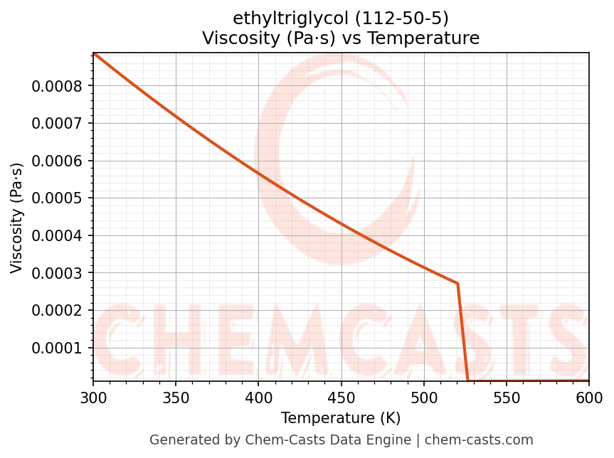 - Specific heat capacity (Cp) indicates the amount of energy required to raise the temperature of ethyltriglycol and is critical for energy balance and heat-exchanger design.