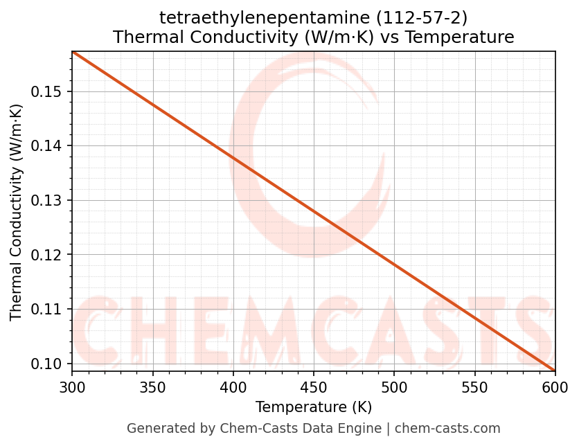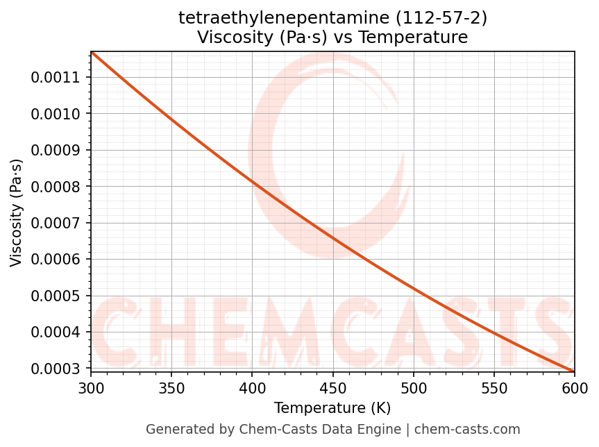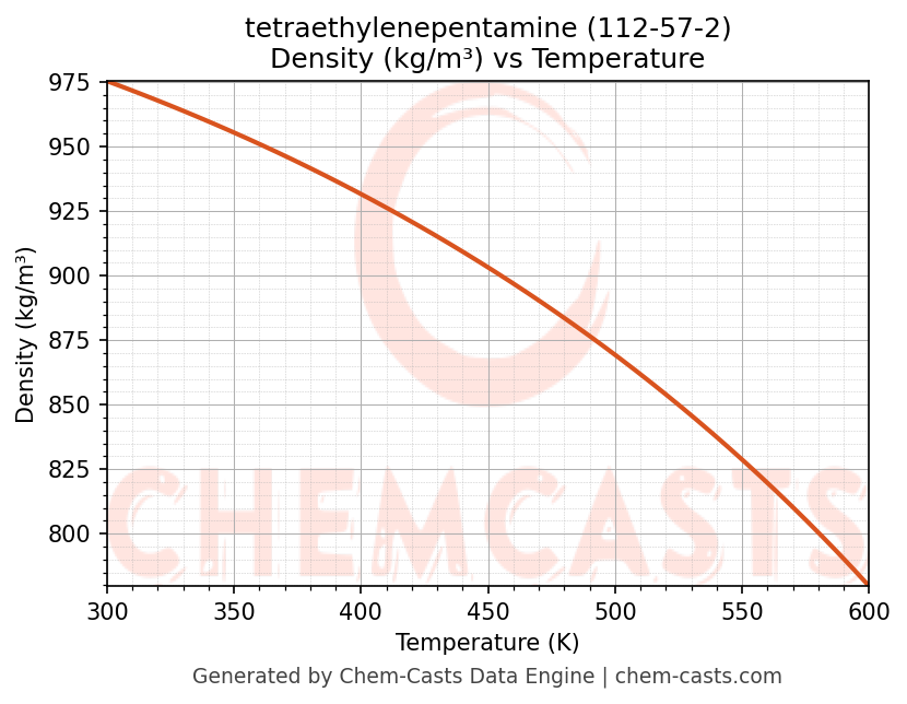 This page presents the temperature-dependent thermodynamic and transport properties of tetraethylenepentamine (CAS 112-57-2) calculated at a constant pressure of 1 atm (101325 Pa) over the temperature range 250-500 K.