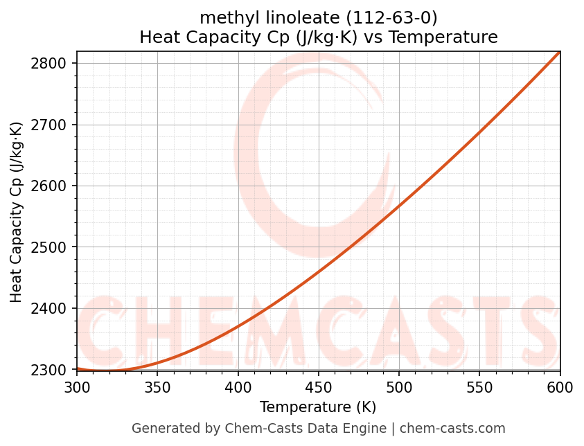 - Specific heat capacity (Cp) indicates the amount of energy required to raise the temperature of methyl linoleate and is critical for energy balance and heat-exchanger design.