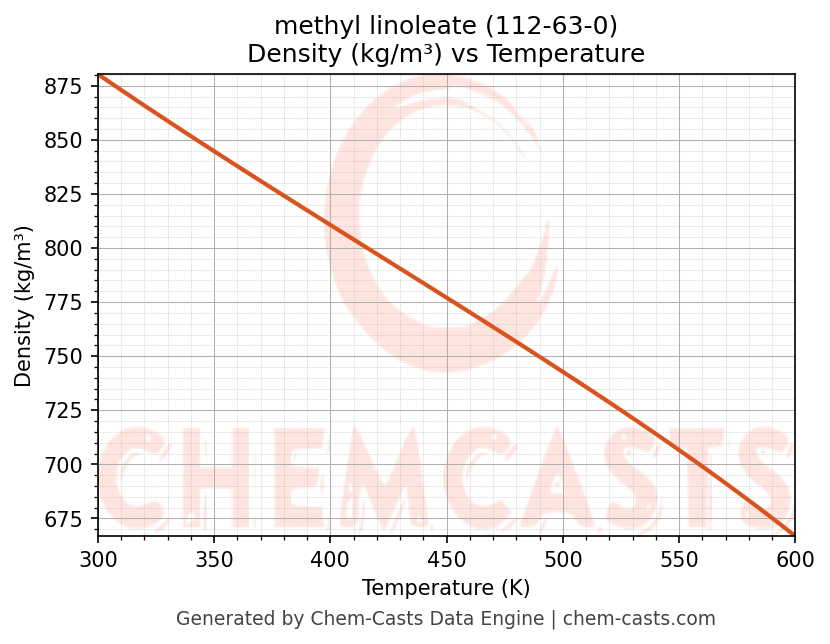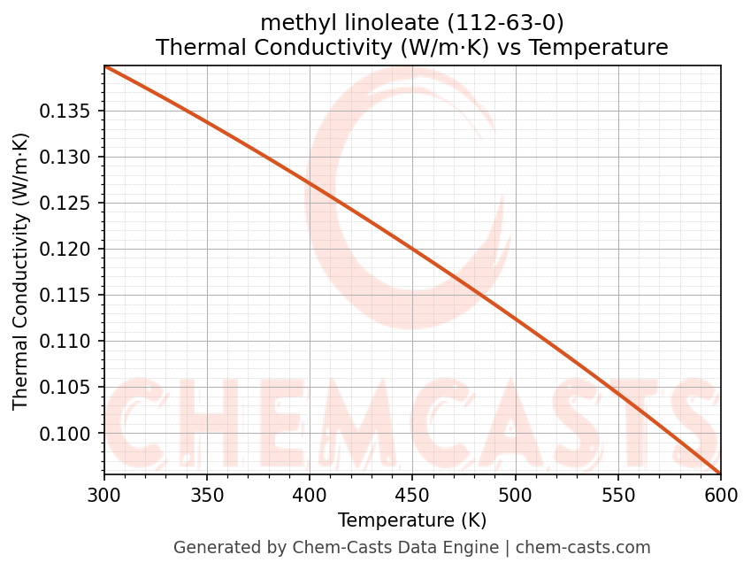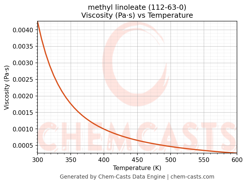This page presents the temperature-dependent thermodynamic and transport properties of methyl linoleate (CAS 112-63-0) calculated at a constant pressure of 1 atm (101325 Pa) over the temperature range 250-500 K.