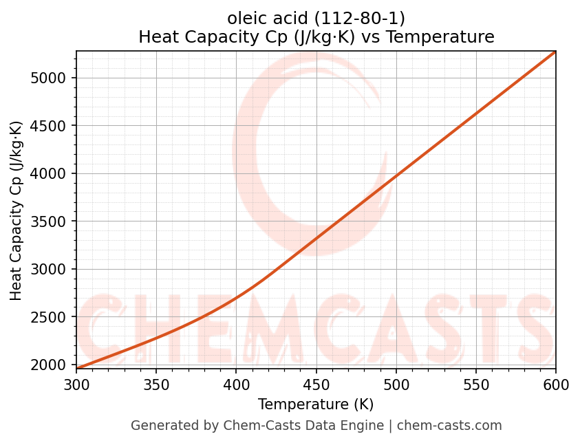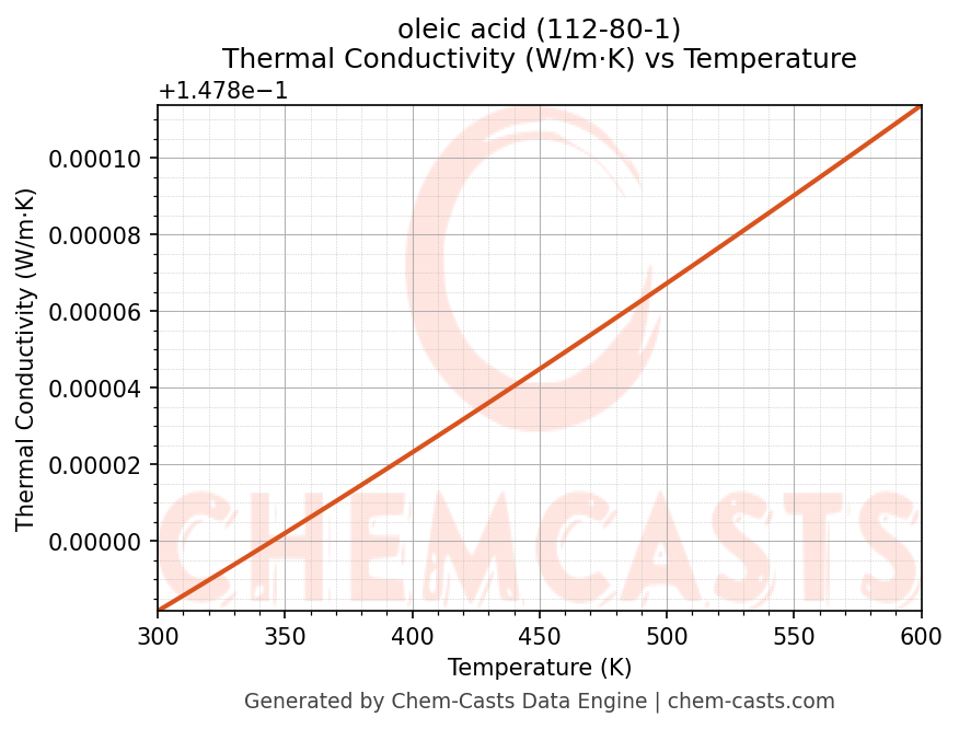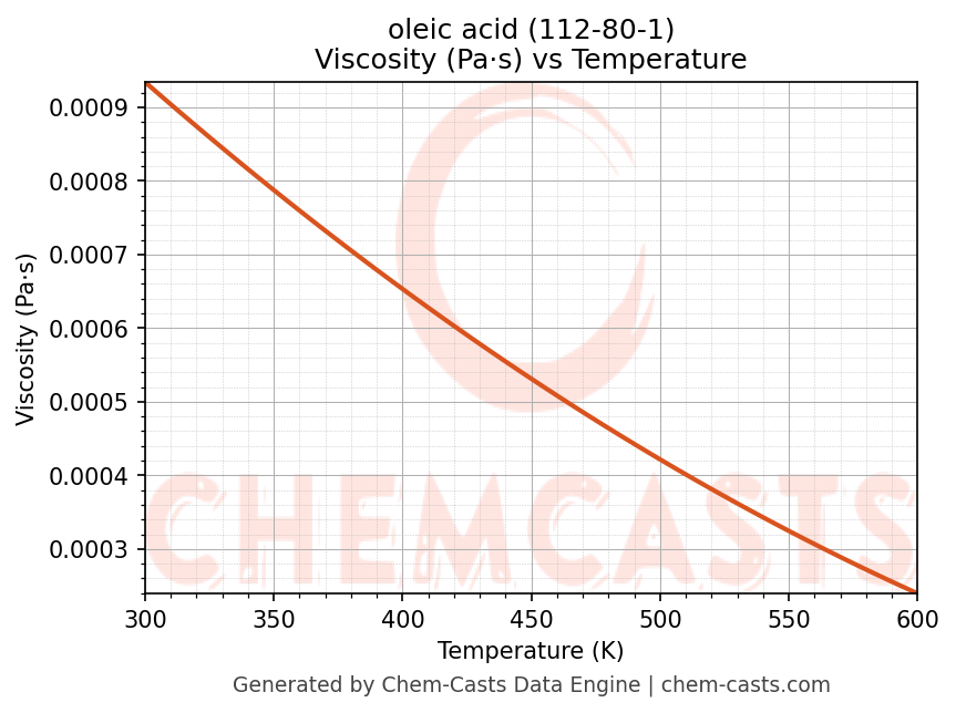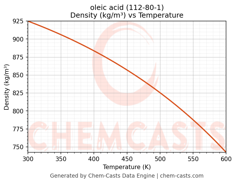 This page presents the temperature-dependent thermodynamic and transport properties of oleic acid (CAS 112-80-1) calculated at a constant pressure of 1 atm (101325 Pa) over the temperature range 250-500 K.
