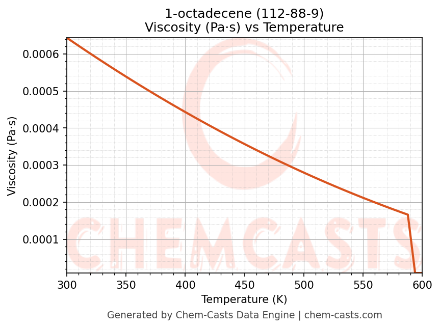 This page presents the temperature-dependent thermodynamic and transport properties of 1-octadecene (CAS 112-88-9) calculated at a constant pressure of 1 atm (101325 Pa) over the temperature range 250-500 K.