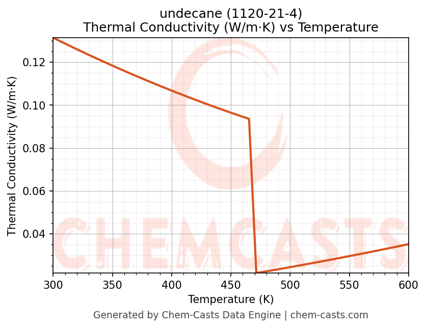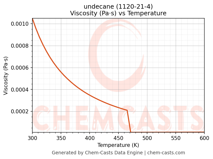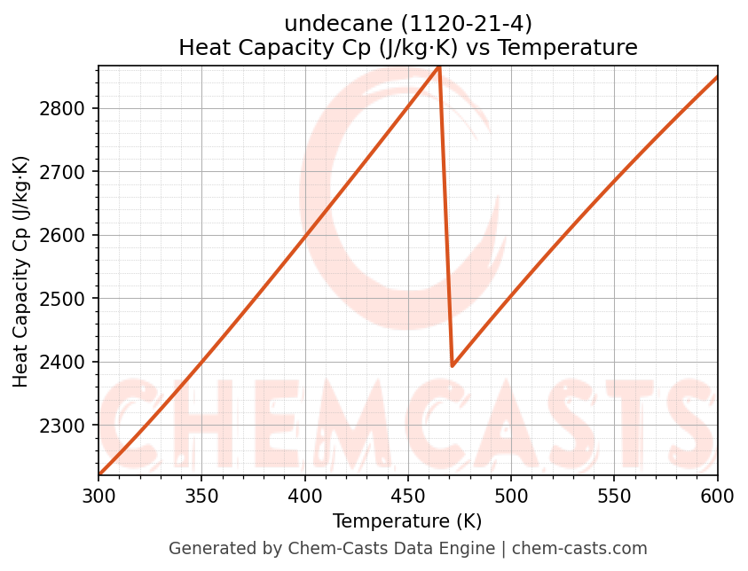 This page presents the temperature-dependent thermodynamic and transport properties of undecane (CAS 1120-21-4) calculated at a constant pressure of 1 atm (101325 Pa) over the temperature range 250-500 K.