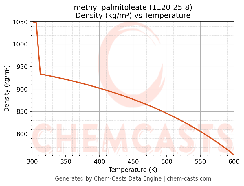 - Specific heat capacity (Cp) indicates the amount of energy required to raise the temperature of methyl palmitoleate and is critical for energy balance and heat-exchanger design.