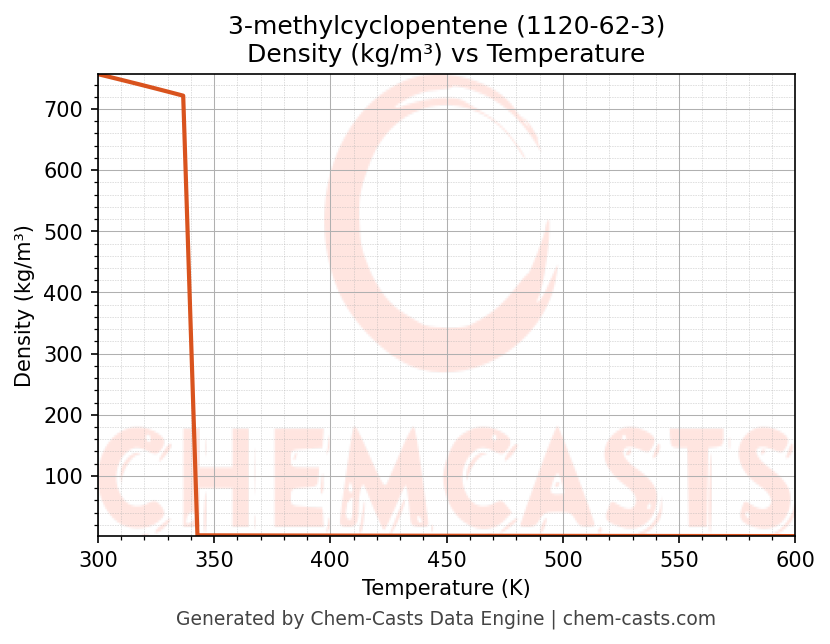 This page presents the temperature-dependent thermodynamic and transport properties of 3-methylcyclopentene (CAS 1120-62-3) calculated at a constant pressure of 1 atm (101325 Pa) over the temperature range 250-500 K.