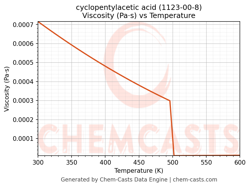 This page presents the temperature-dependent thermodynamic and transport properties of cyclopentylacetic acid (CAS 1123-00-8) calculated at a constant pressure of 1 atm (101325 Pa) over the temperature range 250-500 K.