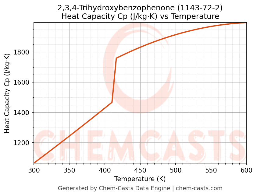 - Specific heat capacity (Cp) indicates the amount of energy required to raise the temperature of 2,3,4-Trihydroxybenzophenone and is critical for energy balance and heat-exchanger design.
