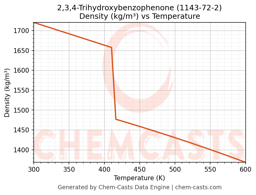 This page presents the temperature-dependent thermodynamic and transport properties of 2,3,4-Trihydroxybenzophenone (CAS 1143-72-2) calculated at a constant pressure of 1 atm (101325 Pa) over the temperature range 250-500 K.