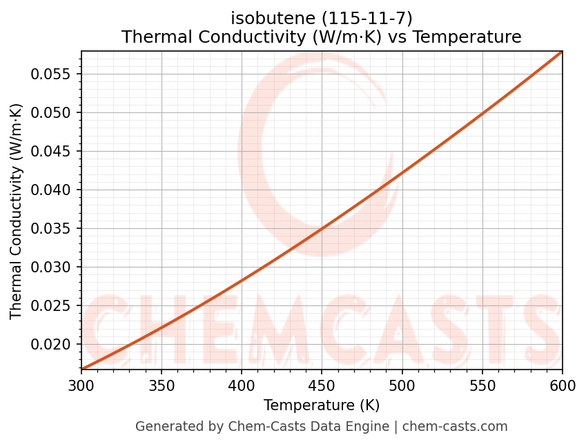 This page presents the temperature-dependent thermodynamic and transport properties of isobutene (CAS 115-11-7) calculated at a constant pressure of 1 atm (101325 Pa) over the temperature range 250-500 K.