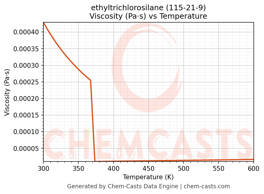 This page presents the temperature-dependent thermodynamic and transport properties of ethyltrichlorosilane (CAS 115-21-9) calculated at a constant pressure of 1 atm (101325 Pa) over the temperature range 250-500 K.