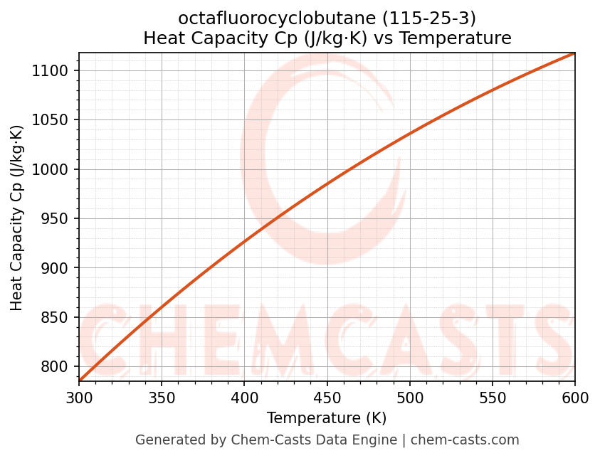- Specific heat capacity (Cp) indicates the amount of energy required to raise the temperature of octafluorocyclobutane and is critical for energy balance and heat-exchanger design.