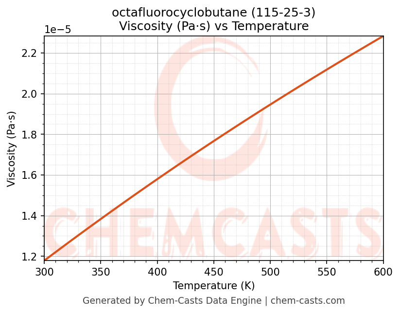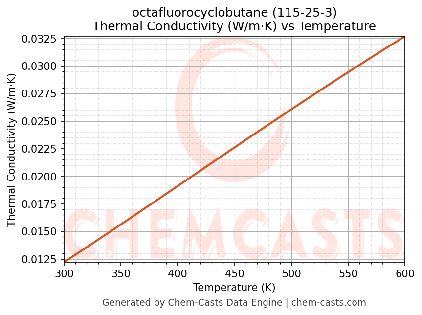 This page presents the temperature-dependent thermodynamic and transport properties of octafluorocyclobutane (CAS 115-25-3) calculated at a constant pressure of 1 atm (101325 Pa) over the temperature range 250-500 K.