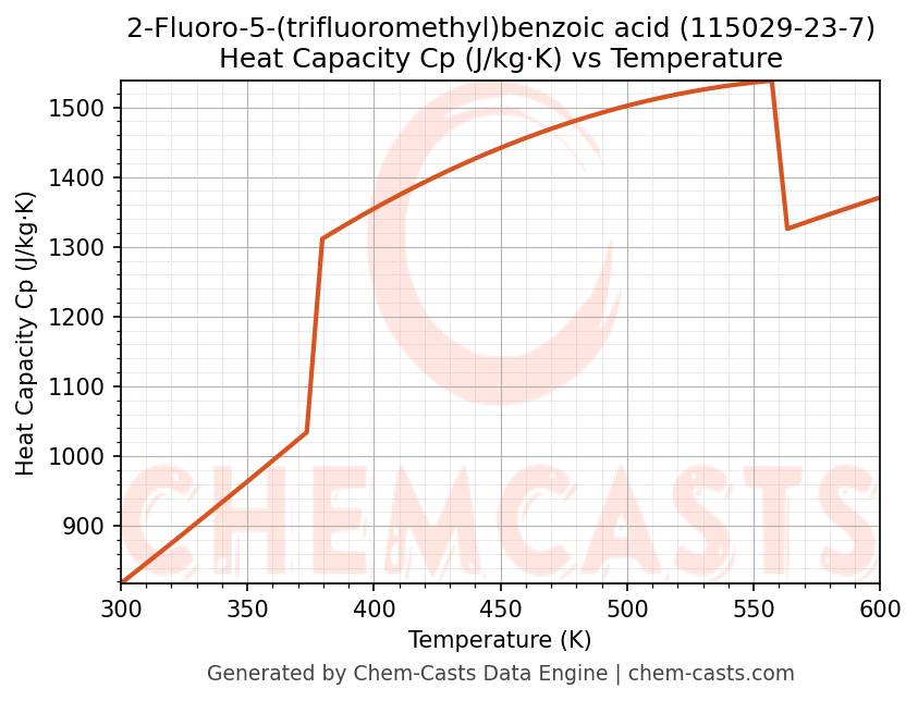 - Specific heat capacity (Cp) indicates the amount of energy required to raise the temperature of 2-Fluoro-5-(trifluoromethyl)benzoic acid and is critical for energy balance and heat-exchanger design.