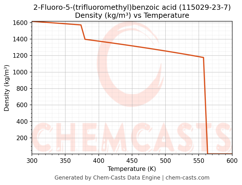 This page presents the temperature-dependent thermodynamic and transport properties of 2-Fluoro-5-(trifluoromethyl)benzoic acid (CAS 115029-23-7) calculated at a constant pressure of 1 atm (101325 Pa) over the temperature range 250-500 K.
