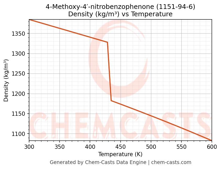This page presents the temperature-dependent thermodynamic and transport properties of 4-Methoxy-4′-nitrobenzophenone (CAS 1151-94-6) calculated at a constant pressure of 1 atm (101325 Pa) over the temperature range 250-500 K.