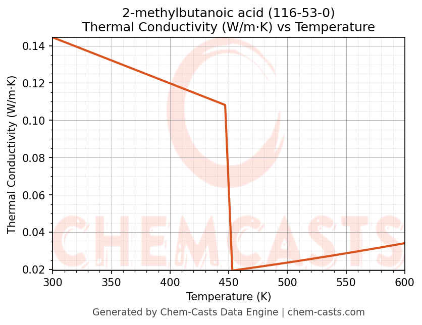 This page presents the temperature-dependent thermodynamic and transport properties of 2-methylbutanoic acid (CAS 116-53-0) calculated at a constant pressure of 1 atm (101325 Pa) over the temperature range 250-500 K.