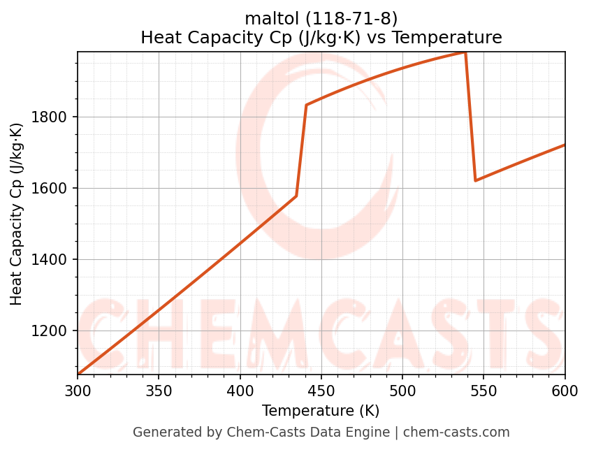 - Specific heat capacity (Cp) indicates the amount of energy required to raise the temperature of maltol and is critical for energy balance and heat-exchanger design.