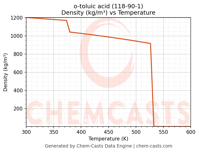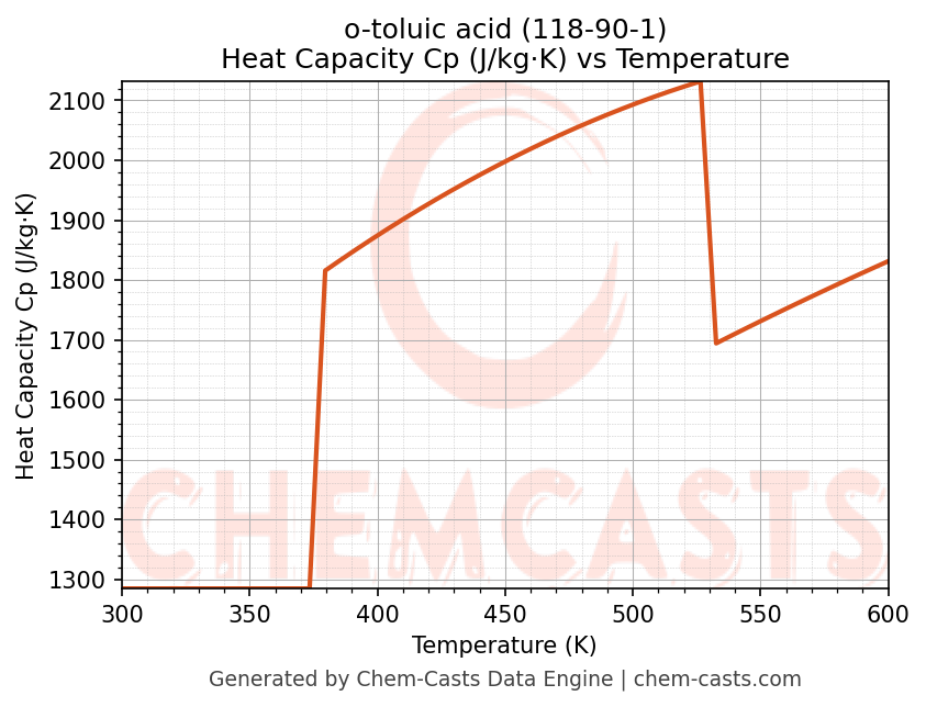 - Specific heat capacity (Cp) indicates the amount of energy required to raise the temperature of o-toluic acid and is critical for energy balance and heat-exchanger design.