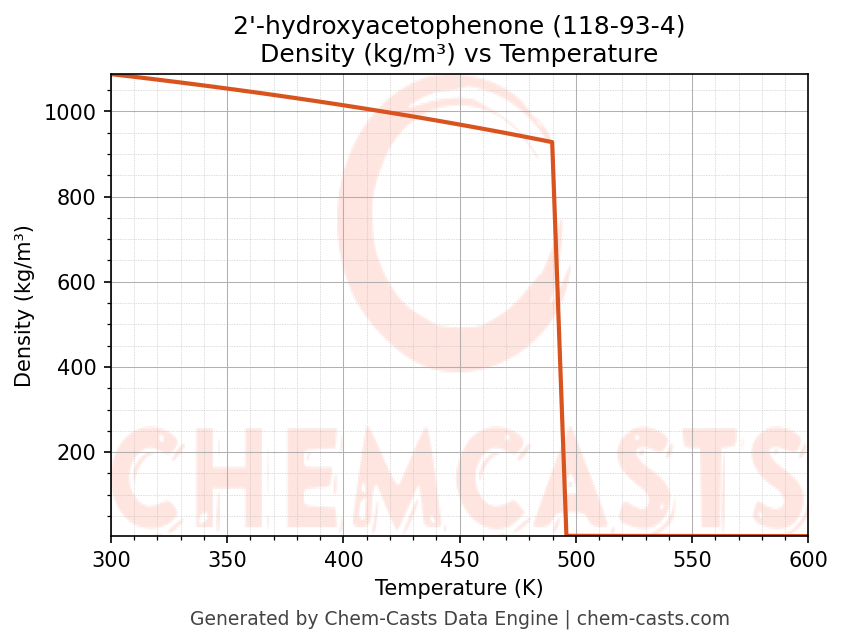This page presents the temperature-dependent thermodynamic and transport properties of 2'-hydroxyacetophenone (CAS 118-93-4) calculated at a constant pressure of 1 atm (101325 Pa) over the temperature range 250-500 K.