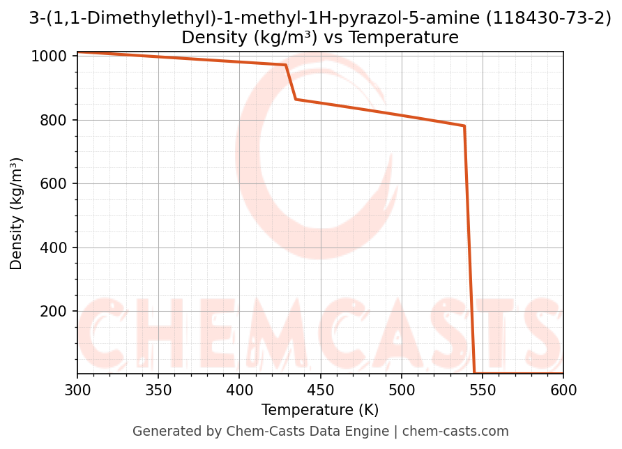 This page presents the temperature-dependent thermodynamic and transport properties of 3-(1,1-Dimethylethyl)-1-methyl-1H-pyrazol-5-amine (CAS 118430-73-2) calculated at a constant pressure of 1 atm (101325 Pa) over the temperature range 250-500 K.