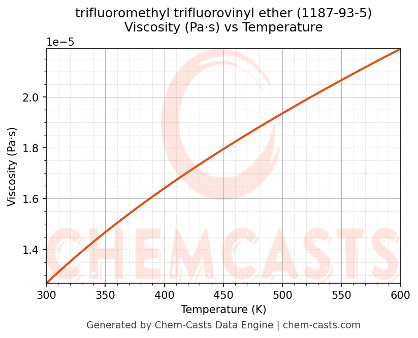 This page presents the temperature-dependent thermodynamic and transport properties of trifluoromethyl trifluorovinyl ether (CAS 1187-93-5) calculated at a constant pressure of 1 atm (101325 Pa) over the temperature range 250-500 K.