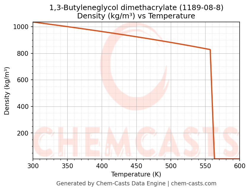 This page presents the temperature-dependent thermodynamic and transport properties of 1,3-Butyleneglycol dimethacrylate (CAS 1189-08-8) calculated at a constant pressure of 1 atm (101325 Pa) over the temperature range 250-500 K.