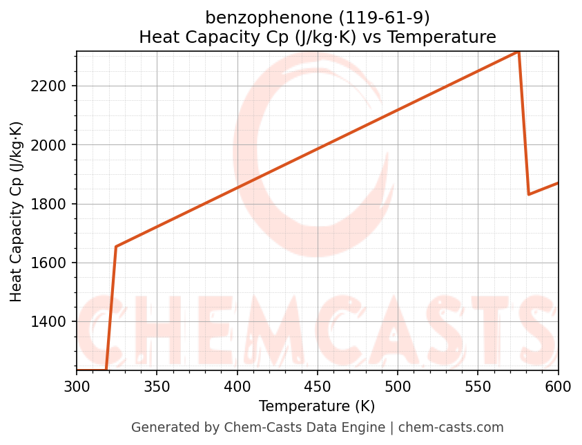 - Specific heat capacity (Cp) indicates the amount of energy required to raise the temperature of benzophenone and is critical for energy balance and heat-exchanger design.