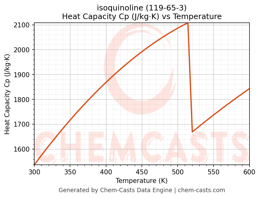 - Specific heat capacity (Cp) indicates the amount of energy required to raise the temperature of isoquinoline and is critical for energy balance and heat-exchanger design.