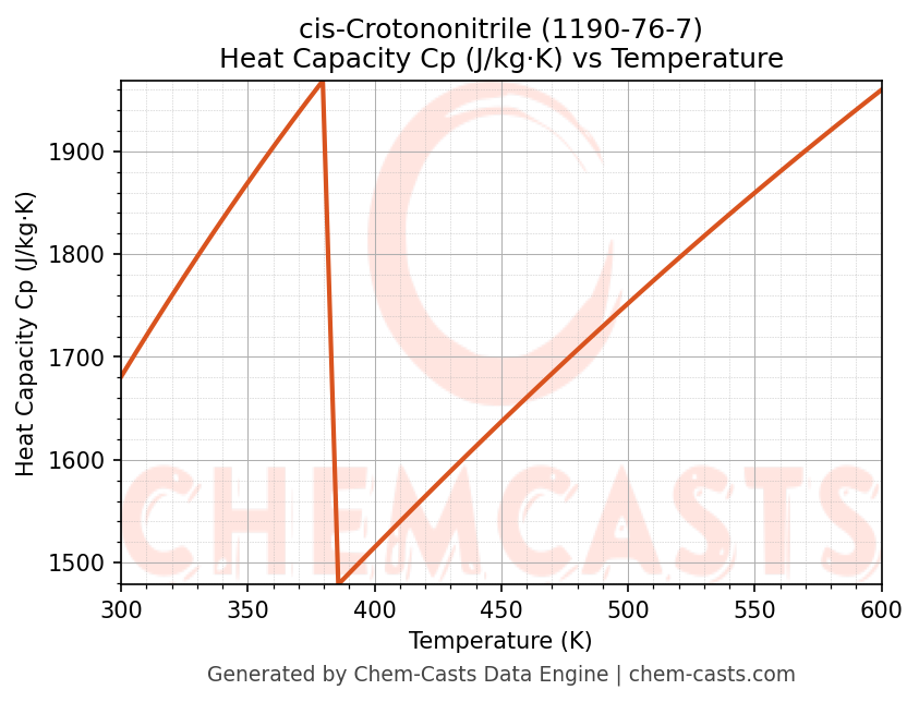 - Specific heat capacity (Cp) indicates the amount of energy required to raise the temperature of cis-Crotononitrile and is critical for energy balance and heat-exchanger design.