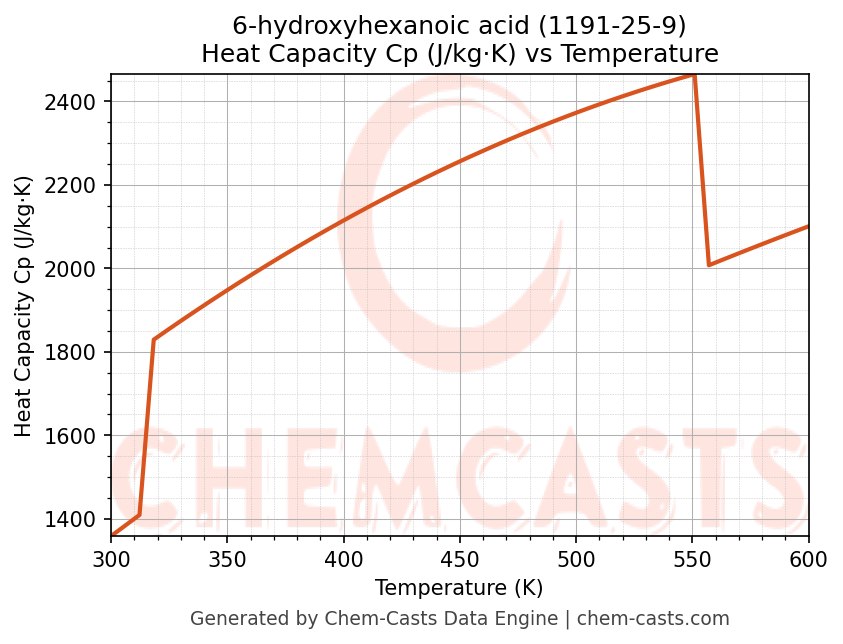- Specific heat capacity (Cp) indicates the amount of energy required to raise the temperature of 6-hydroxyhexanoic acid and is critical for energy balance and heat-exchanger design.