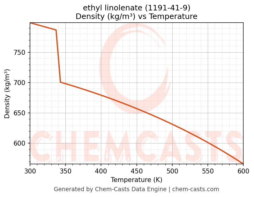 This page presents the temperature-dependent thermodynamic and transport properties of ethyl linolenate (CAS 1191-41-9) calculated at a constant pressure of 1 atm (101325 Pa) over the temperature range 250-500 K.