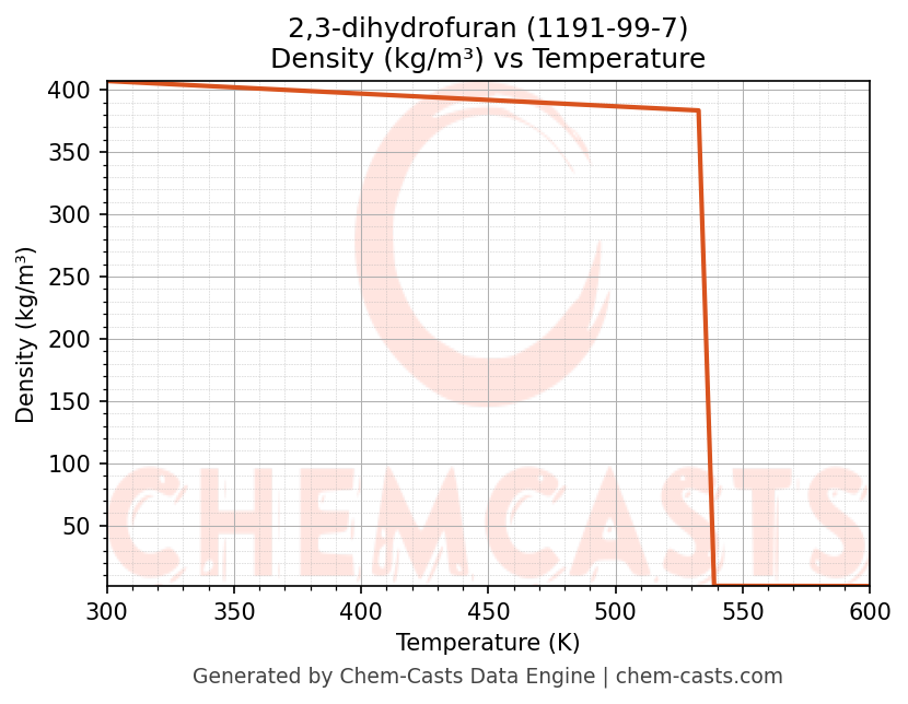 This page presents the temperature-dependent thermodynamic and transport properties of 2,3-dihydrofuran (CAS 1191-99-7) calculated at a constant pressure of 1 atm (101325 Pa) over the temperature range 250-500 K.