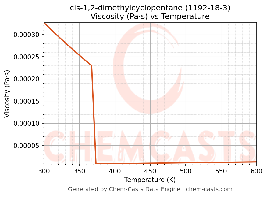 This page presents the temperature-dependent thermodynamic and transport properties of cis-1,2-dimethylcyclopentane (CAS 1192-18-3) calculated at a constant pressure of 1 atm (101325 Pa) over the temperature range 250-500 K.