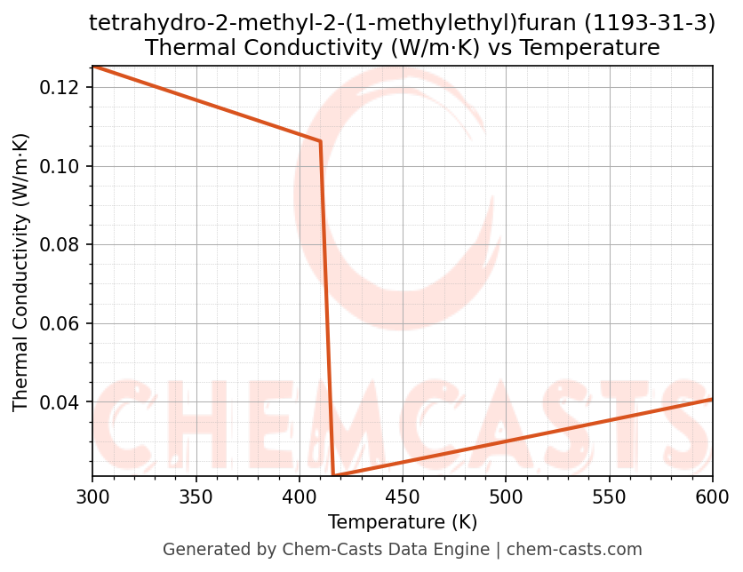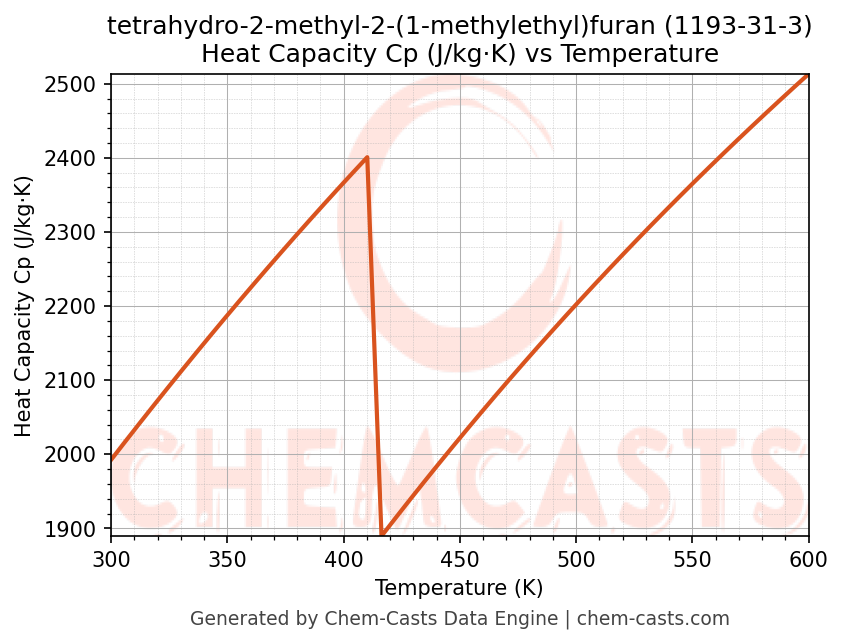 - Specific heat capacity (Cp) indicates the amount of energy required to raise the temperature of tetrahydro-2-methyl-2-(1-methylethyl)furan and is critical for energy balance and heat-exchanger design.