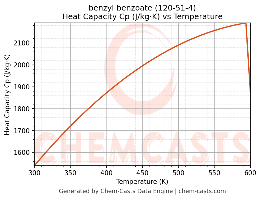 - Specific heat capacity (Cp) indicates the amount of energy required to raise the temperature of benzyl benzoate and is critical for energy balance and heat-exchanger design.