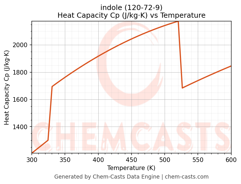 - Specific heat capacity (Cp) indicates the amount of energy required to raise the temperature of indole and is critical for energy balance and heat-exchanger design.
