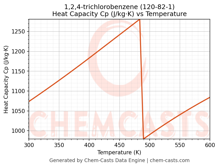 - Specific heat capacity (Cp) indicates the amount of energy required to raise the temperature of 1,2,4-trichlorobenzene and is critical for energy balance and heat-exchanger design.
