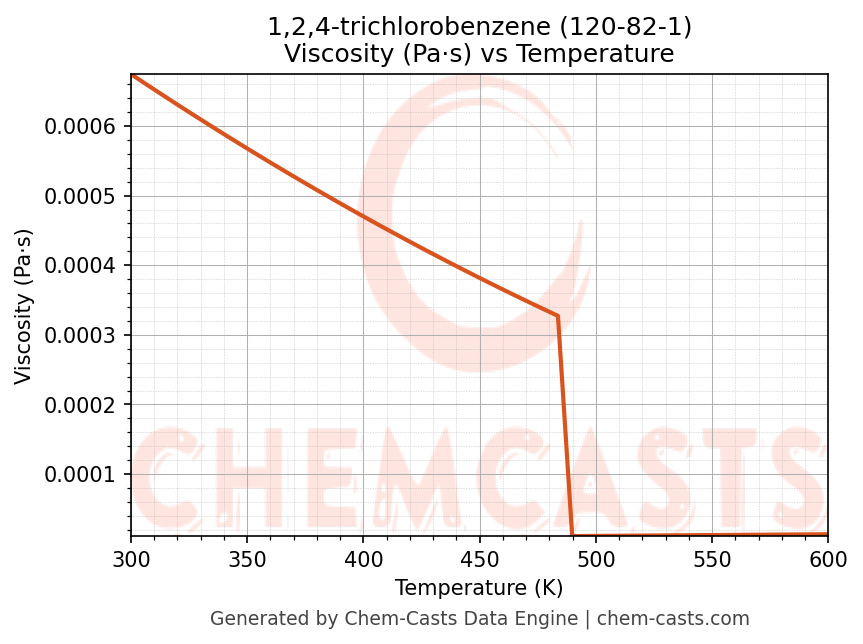 This page presents the temperature-dependent thermodynamic and transport properties of 1,2,4-trichlorobenzene (CAS 120-82-1) calculated at a constant pressure of 1 atm (101325 Pa) over the temperature range 250-500 K.