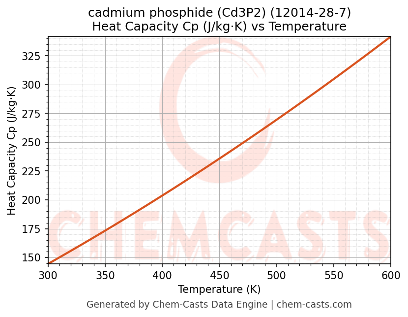 - Specific heat capacity (Cp) indicates the amount of energy required to raise the temperature of cadmium phosphide (Cd3P2) and is critical for energy balance and heat-exchanger design.