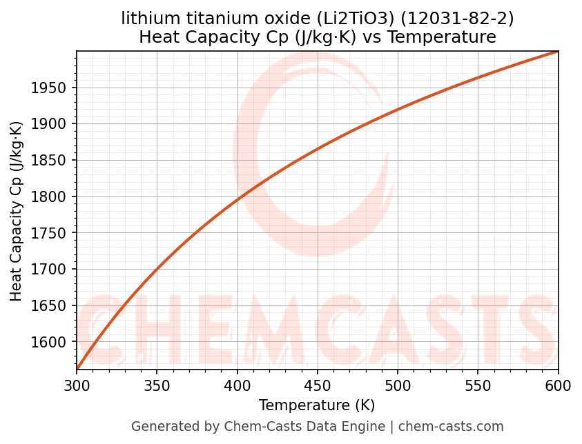 - Specific heat capacity (Cp) indicates the amount of energy required to raise the temperature of lithium titanium oxide (Li2TiO3) and is critical for energy balance and heat-exchanger design.