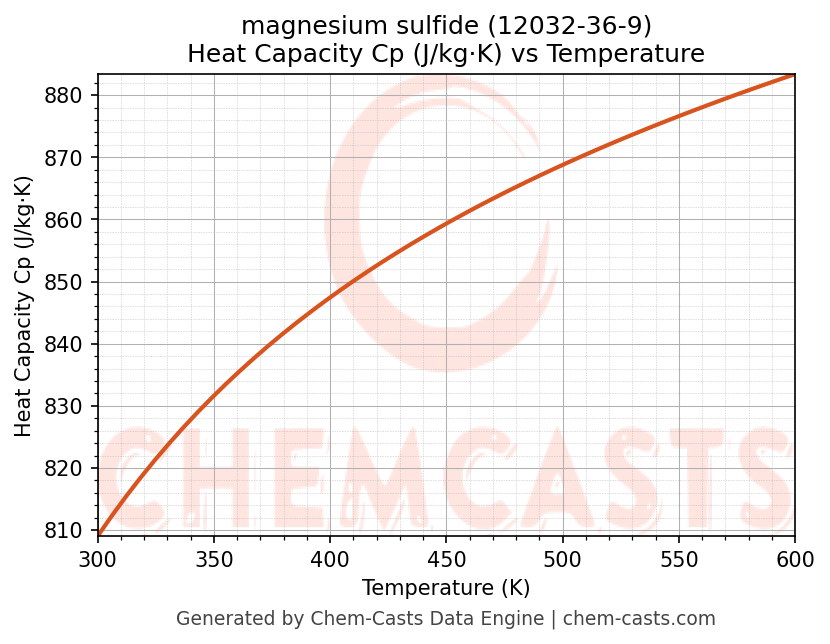 - Specific heat capacity (Cp) indicates the amount of energy required to raise the temperature of magnesium sulfide and is critical for energy balance and heat-exchanger design.