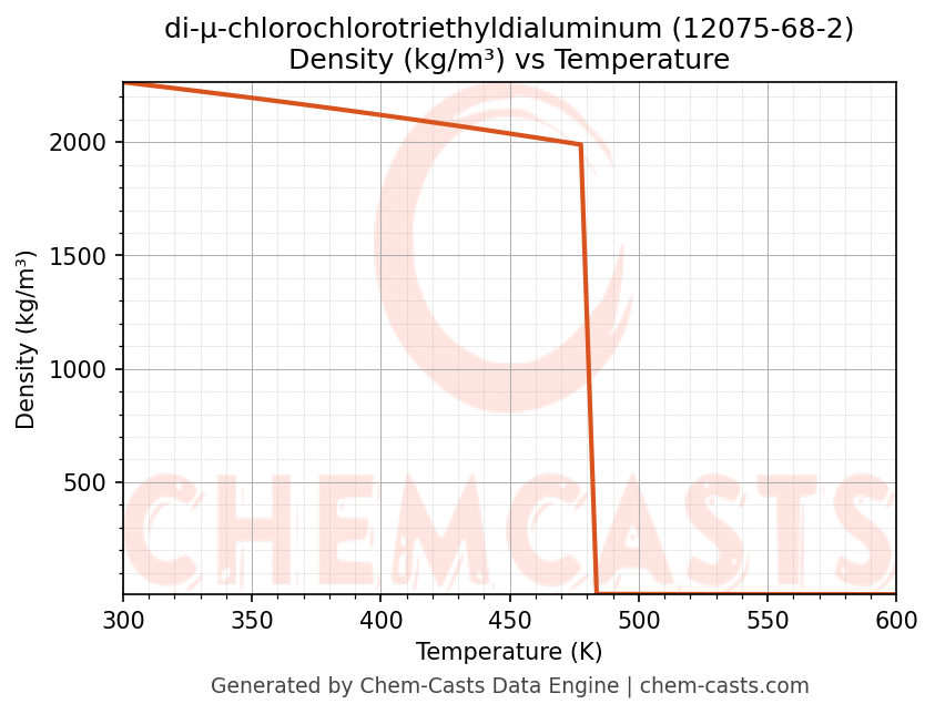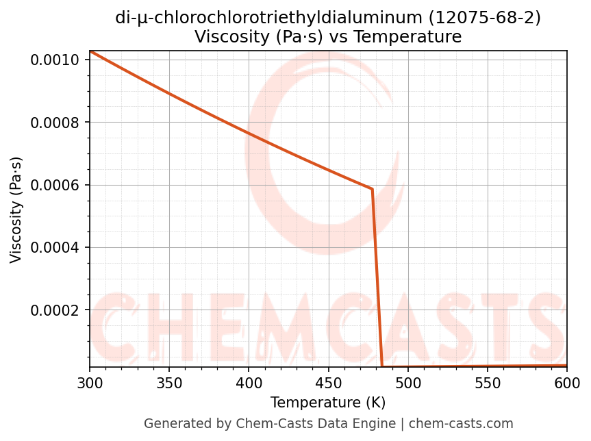 This page presents the temperature-dependent thermodynamic and transport properties of di-μ-chlorochlorotriethyldialuminum (CAS 12075-68-2) calculated at a constant pressure of 1 atm (101325 Pa) over the temperature range 250-500 K.