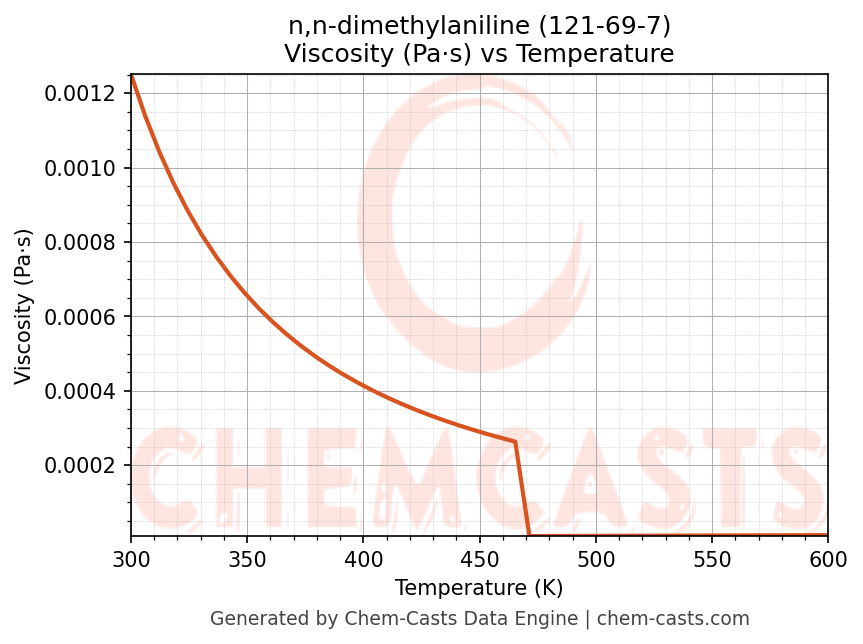 This page presents the temperature-dependent thermodynamic and transport properties of n,n-dimethylaniline (CAS 121-69-7) calculated at a constant pressure of 1 atm (101325 Pa) over the temperature range 250-500 K.